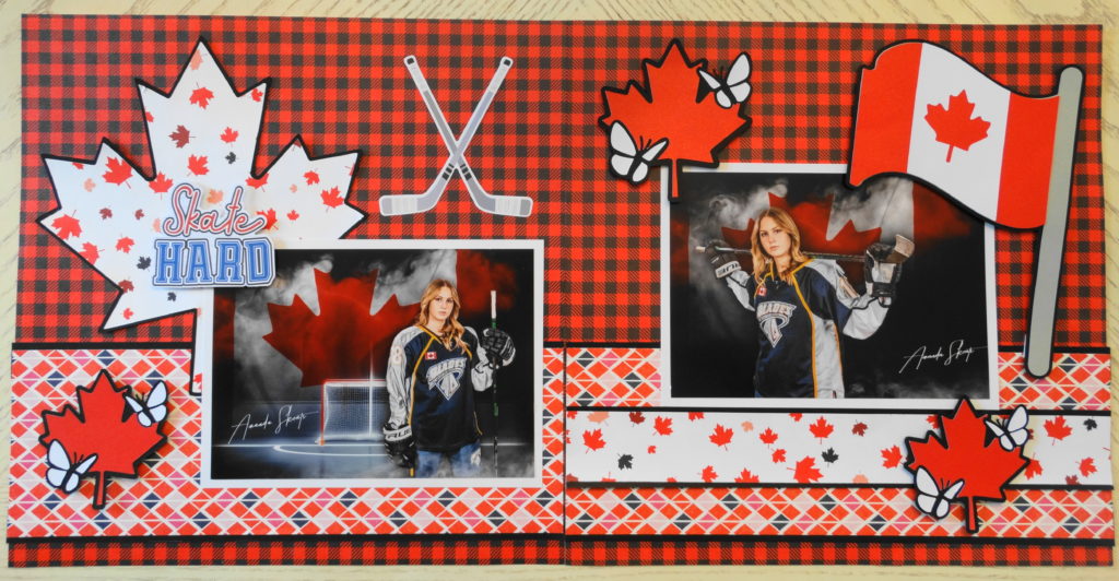 The paper is from CM Canadian Pride Collection. The large leaf is from Milky Way in Cricut Design Space. The sticks are from Ice Hockey, the leaf w/ butterflies is from Apple Grove Designs, and the flag is from Canada Party Decor. I embellished with CM – On The Ice die cuts.