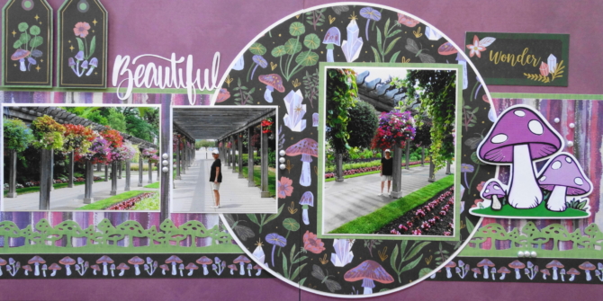 These papers are from the Paper Studio Impressionist Floral Pad and Recollections Magical Woodland Pad. The large mushroom image is from Quail & Co. Designs in Cricut Access. The title is from Endless Time Graphics and the tags are from Preserves. I used the mushroom border punch from CM for the border.