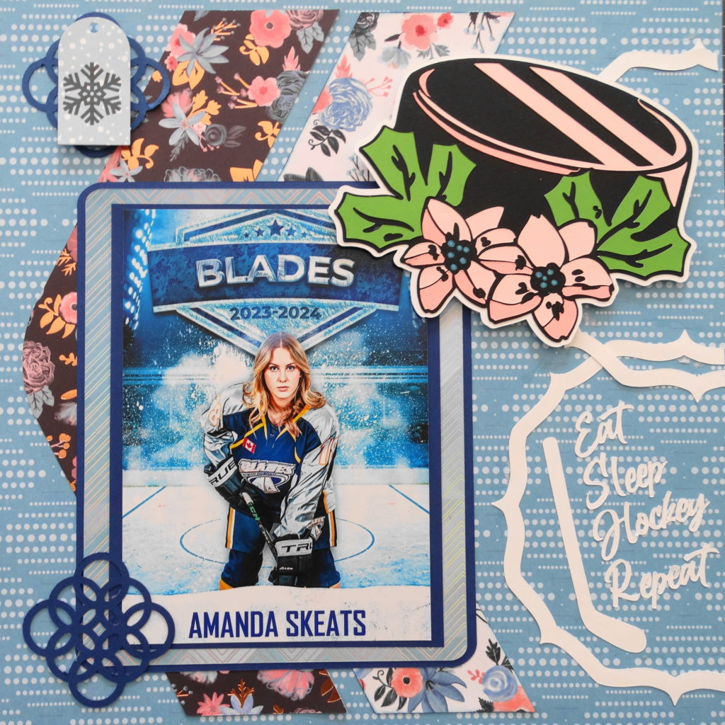 The paper is from Recollections Black Jack Pad. The hockey stick & puck are from Total Sports in Cricut Access. The skate is from MEM SVG Supply, the title is from Diva Watts Designs, the trophy is from Pardon My Tone. and the madel is from Sarah Evans.