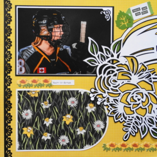 The paper is from Paper Studio When I Grow Up. The amazing sticks with flowers image is from Ice Hockey Designs in Cricut Access. The sunflowers are from Apple Grove Designs, the filmstrip is from the CM postage stamp border punch. The skating girl is from Kukai Art, the pucks are from Sports Mania The banners are from Anne Louise.