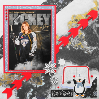 The paper is from Paper Studio Blue Geode. The red arrow is from Miss Kate Cuttables The Great Outdoors in Cricut Access. The fence is from imply Craft, the snowflakes are from NC Mom, the goal is from Go Canada, the penguins are from Crafty Mama and Sanqunettei Design. The title is from Sarah Bailey and the embellishments are from Creative Memories On the Ice and Echo Park Magic of Winter.