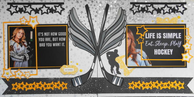 The paper is from Recollections Hang The Stars Pad. The star frame is from Apple Grove Designs. The yellow star border is from CTMH Artbooking cartridge in Cricut Access. The black star border is from SVG Garage. The hockey sticks image is from Ice Hockey Designs.