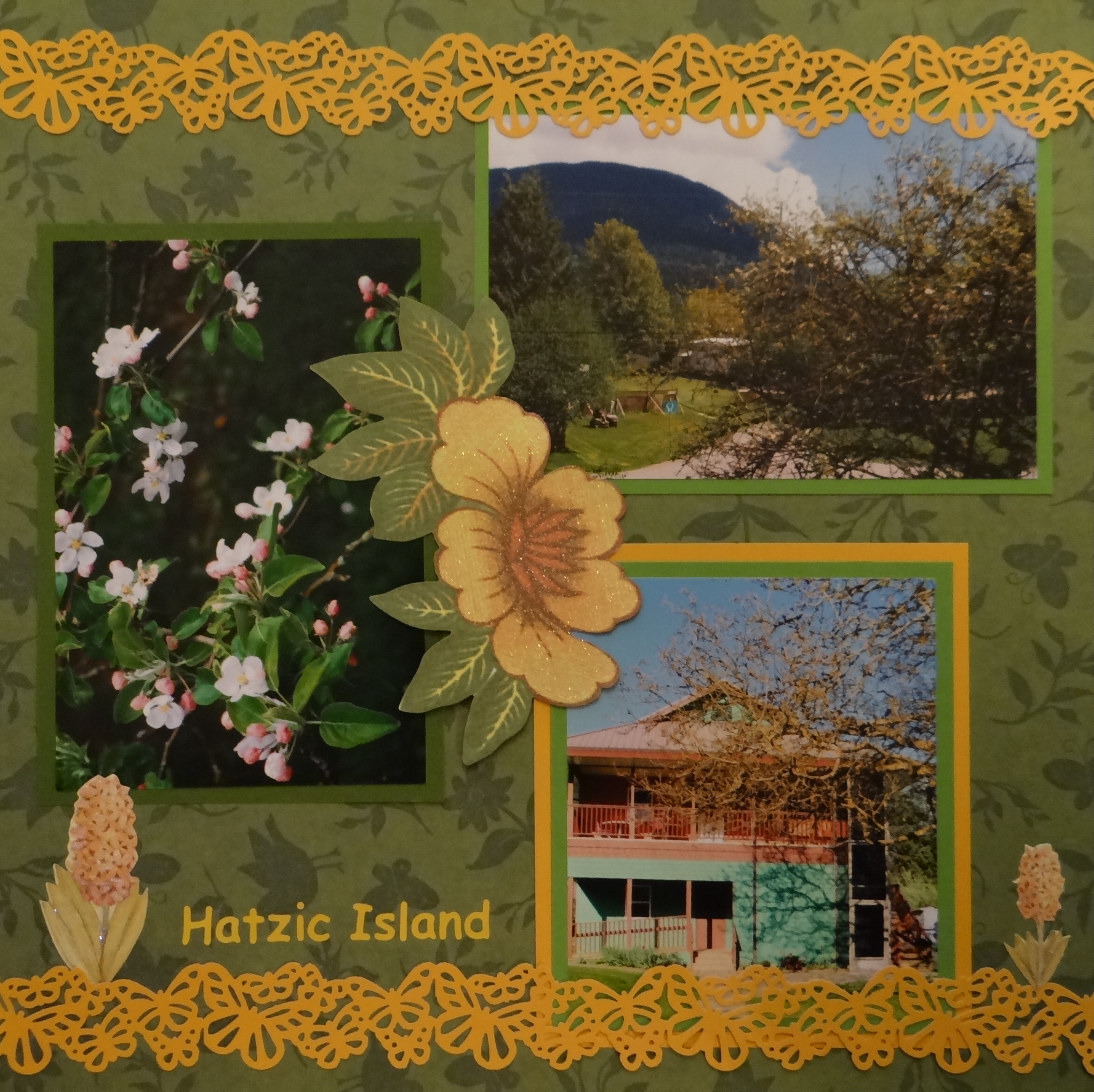 I used a Martha Stewart border punch to mat the photo on all 4 sides, but each side has a new colour of the mat. I love the effect I got. The scalloped square backgrounds and the bird with branches are from Storybook. The title “XOXO” is from Phrases. The scrapbook paper is from DCWV Blossoms and Butterflies Paper Stack. (cottage, family, )