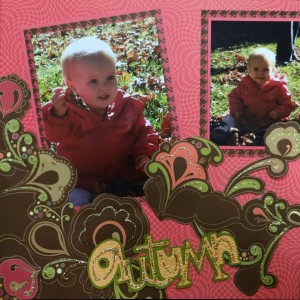 The title “Pumpkin” is from Elmo and Friends Holiday. I used a Martha Stewart border punch to mat a photo. The scrapbook paper is from Recollections Retro Collage. That brand is from Michael’s. (fall, autumn, )